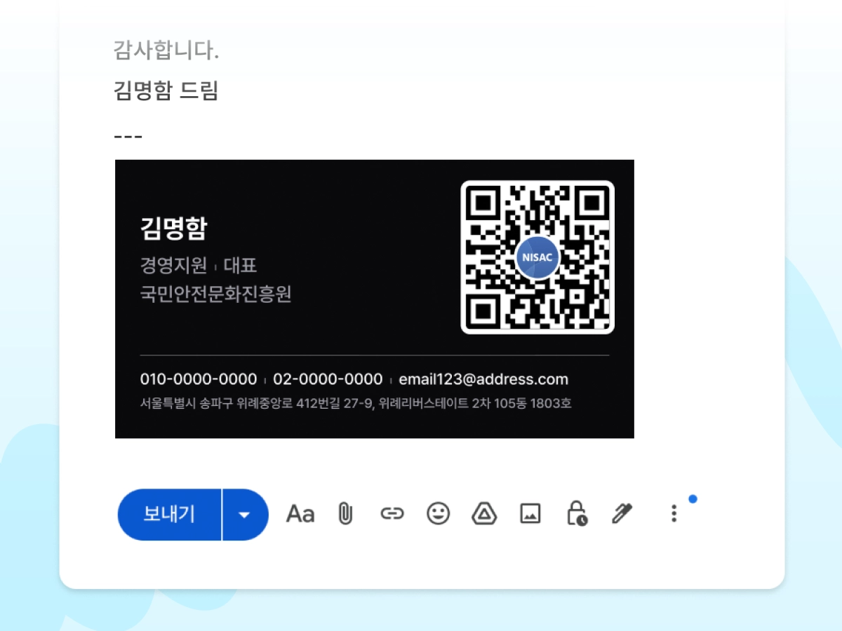 업무상 이메일 소통과 슬라이스 명함 전달을 위한 이메일 서명이에요. 이메일에 서명을 추가해 보내면, 수신인이 서명의 QR을 스캔해 나의 디지털 명함을 확인하고 저장할 수 있어요.