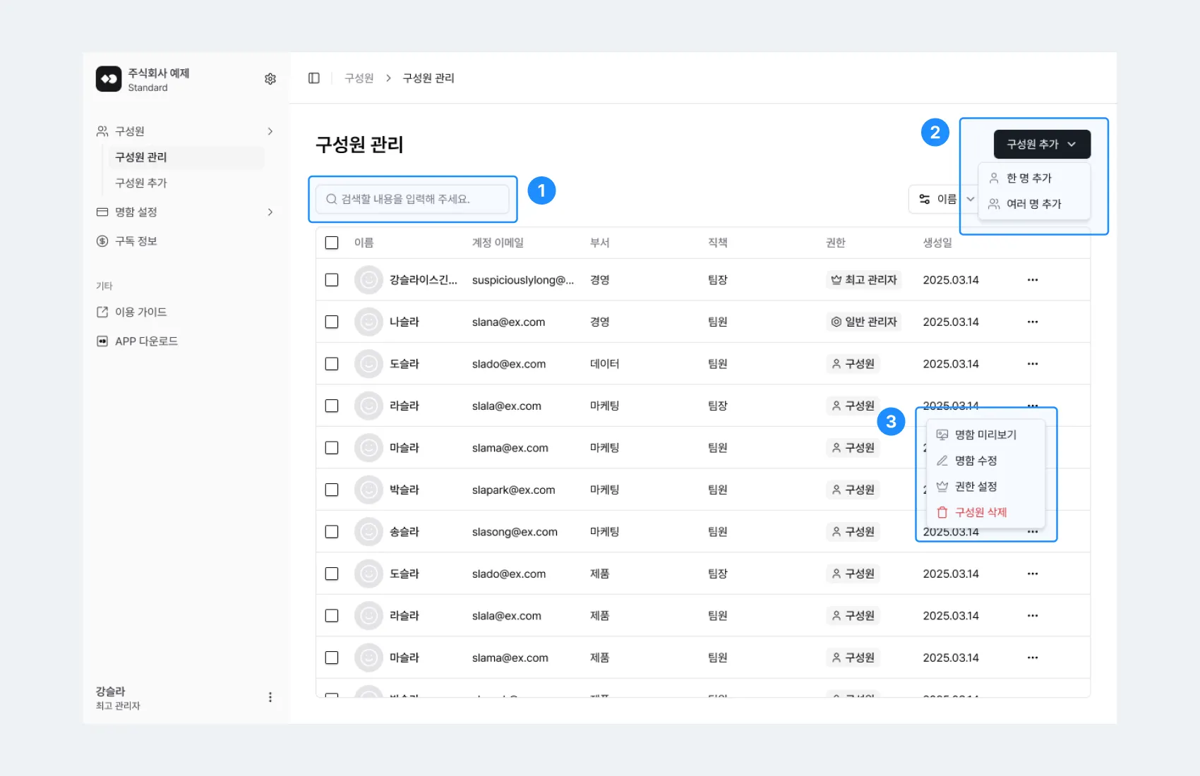 구성원의 정보와 명함을 확인하고 수정하고, 새로운 구성원을 추가하거나, 퇴사한 구성원은 삭제할 수 있어요.