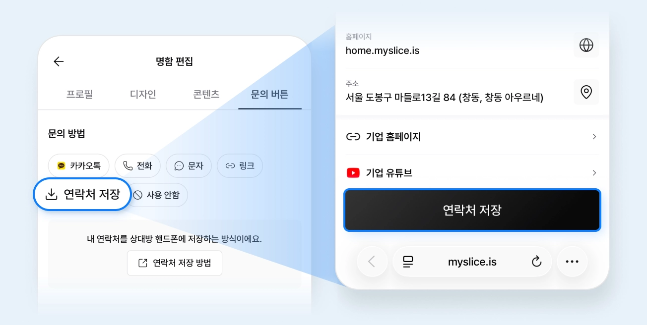 연락처 저장 버튼은 문의 버튼 > 문의 방법 > 연락처 저장을 설정해야 표시됩니다.