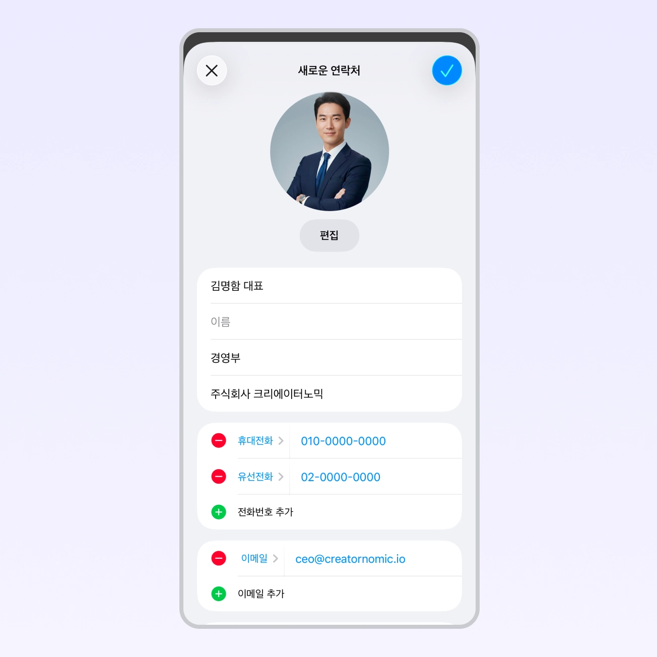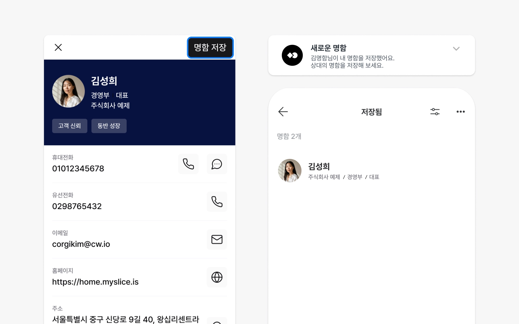 명함 저장 버튼을 눌러 앱 명함첩에 바로 저장할 수 있어요.