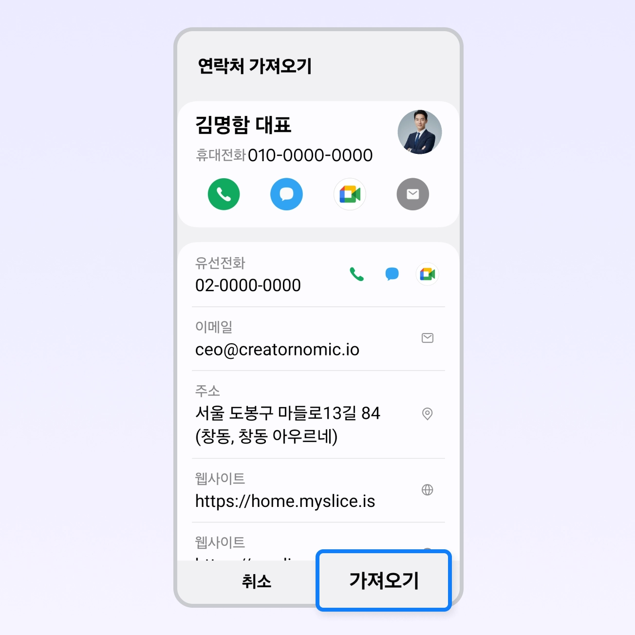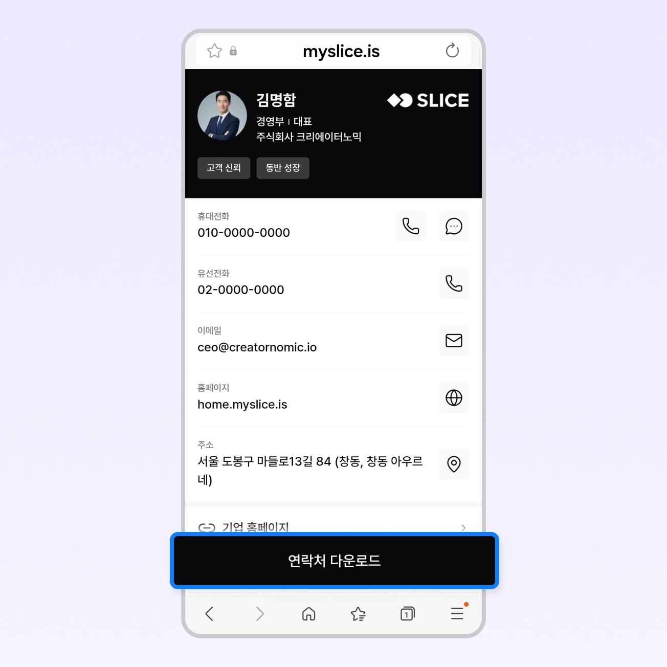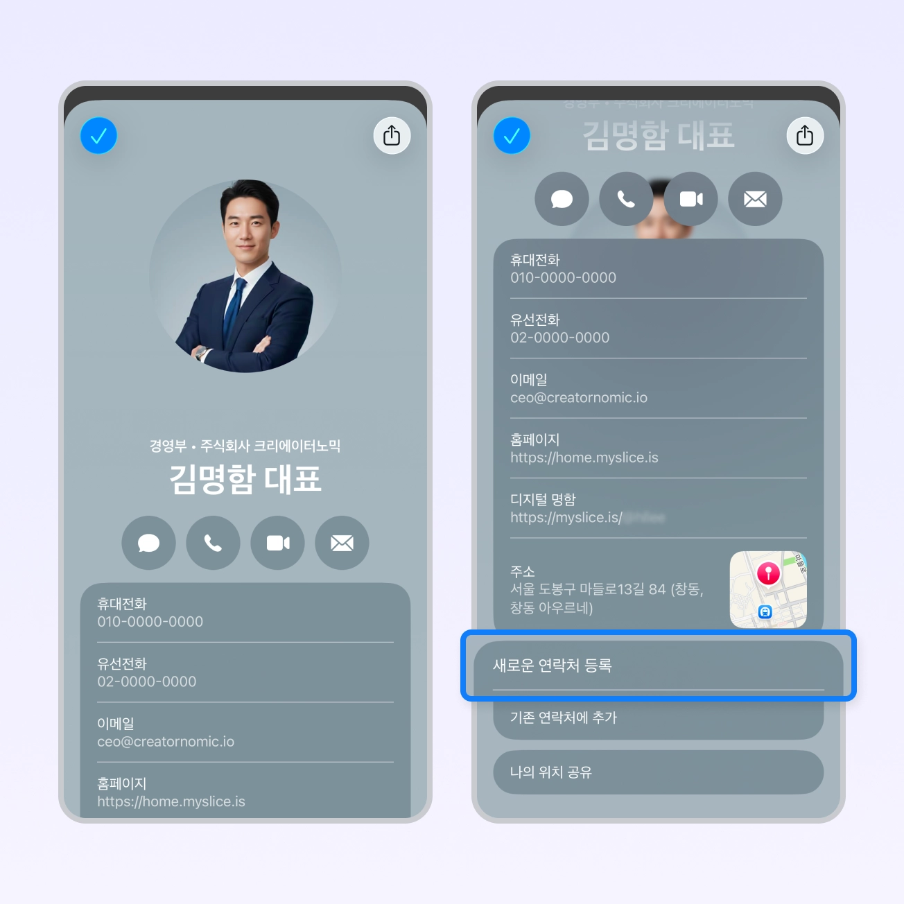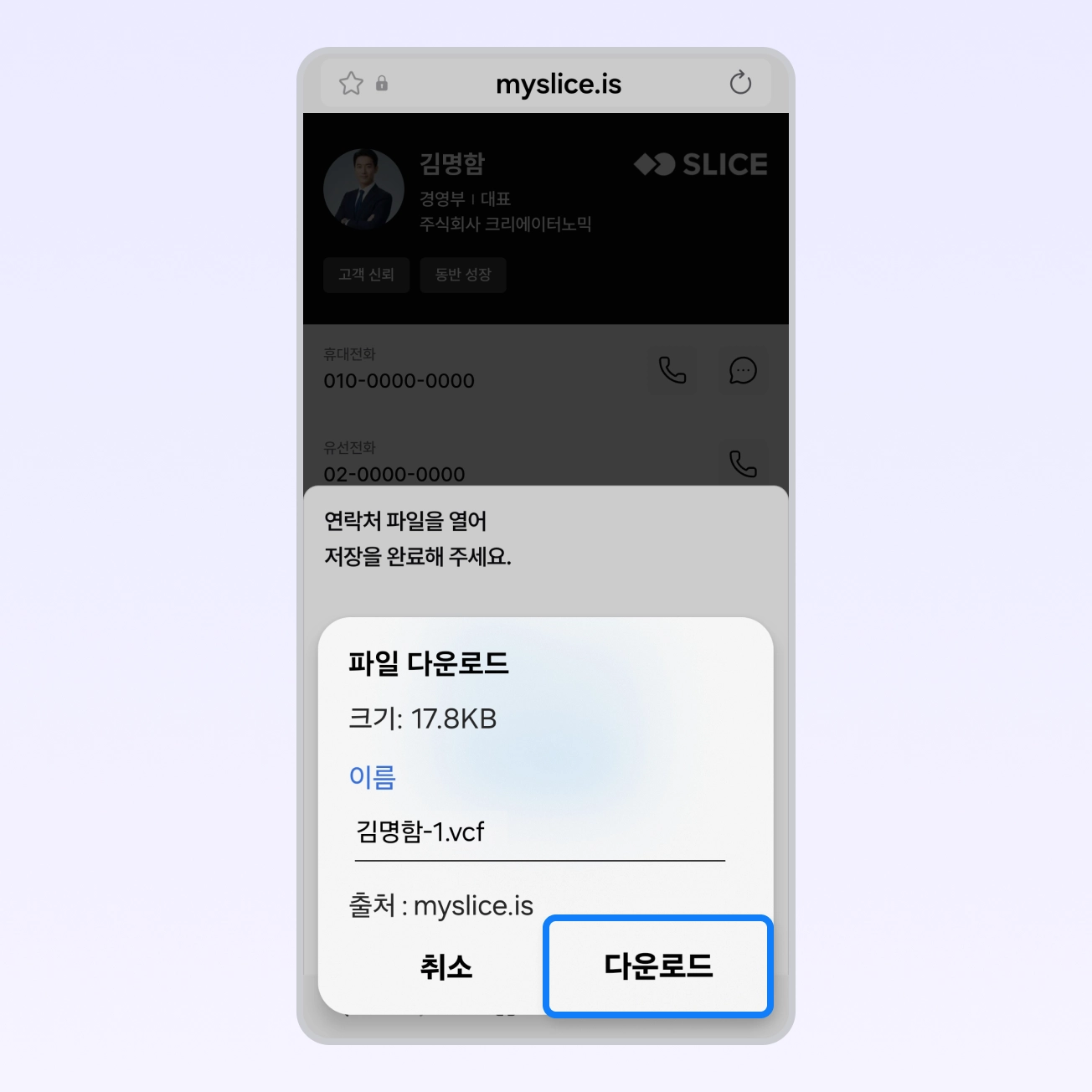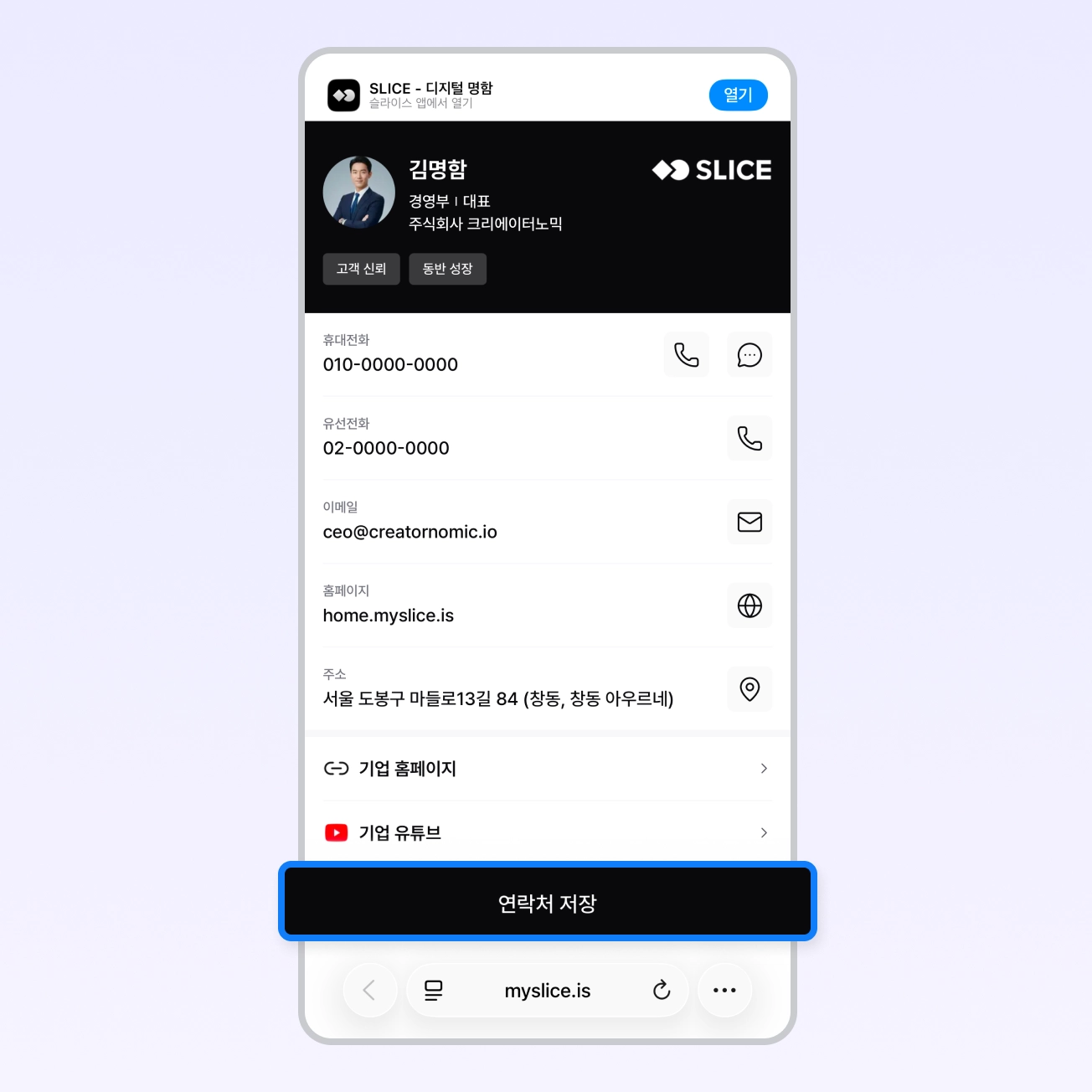 슬라이스 앱이 설치된 기기로 슬라이스 명함을 받으면 저장이 간편해요.