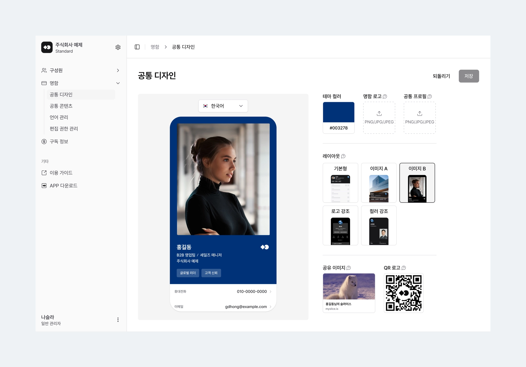 공통 디자인 메뉴의 수정 내용은 저장 즉시 모든 구성원의 명함에 공통 적용되니 유의해 주세요.