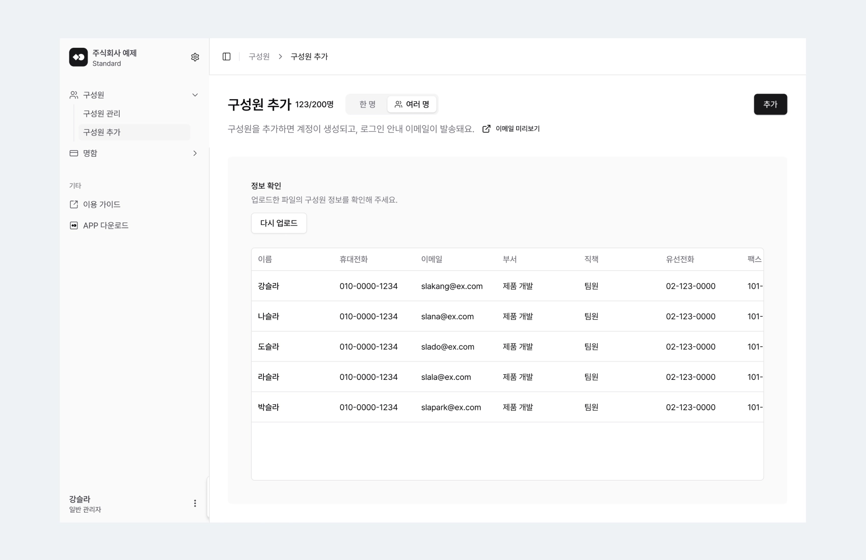 업로드한 구성원 정보를 확인하고, 추가를 눌러 시스템에 등록해요.