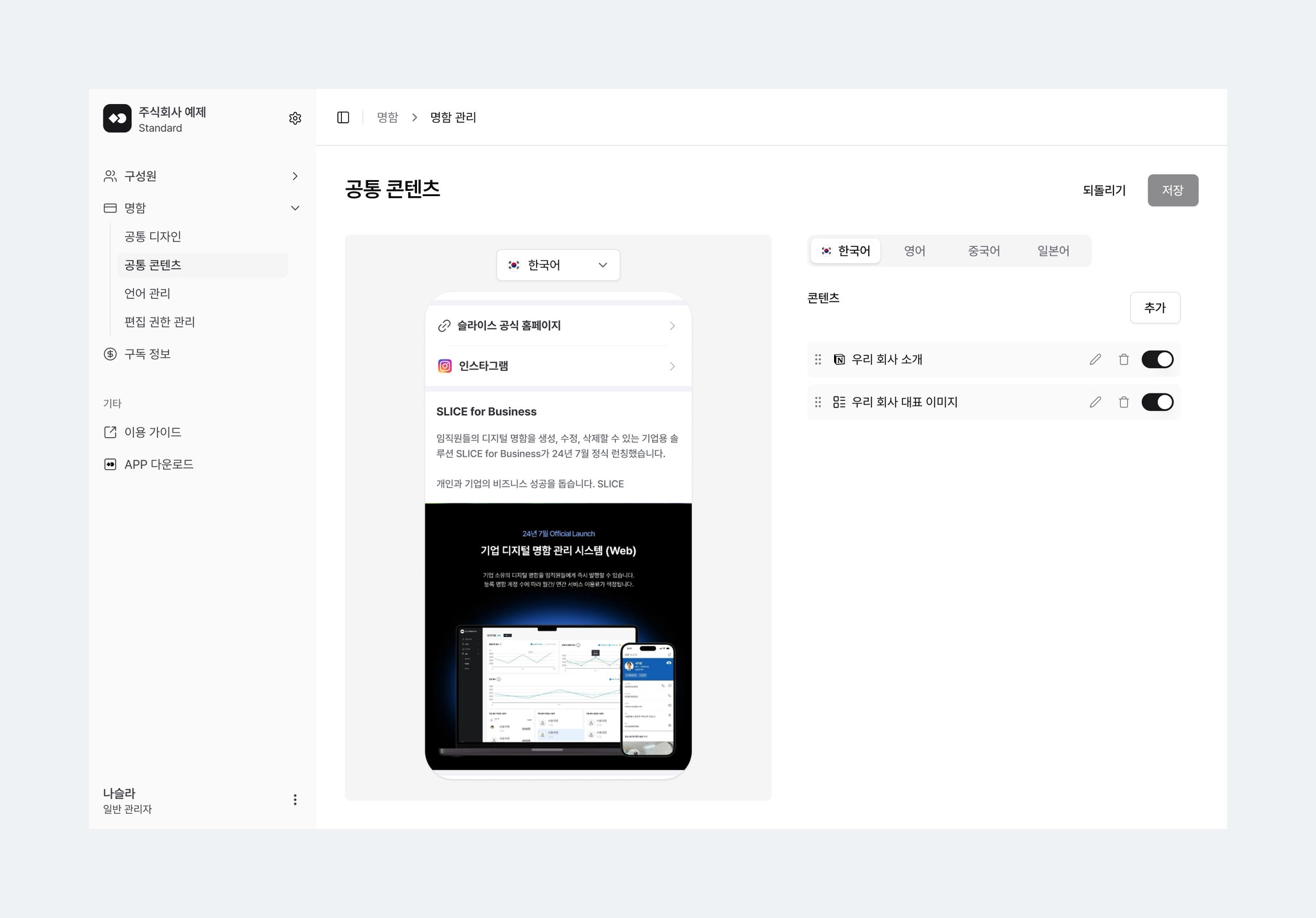 공통 콘텐츠 메뉴의 수정 내용은 저장 즉시 모든 구성원의 명함에 공통 적용되니 유의해 주세요.